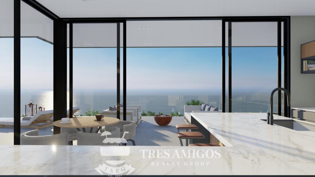 At the center of the home, a chef’s kitchen flows into a dramatic great room framed by floor-to-ceiling glass, creating a seamless transition to an expansive outdoor terrace. Clear tempered glass railings ensure uninterrupted Pacific views, while the spectacular infinity-edge swimming pool appears to spill directly into the ocean below. From this elevated vantage point, it’s common to spot humpback whales and dolphins moving through the bay—an extraordinary daily experience.