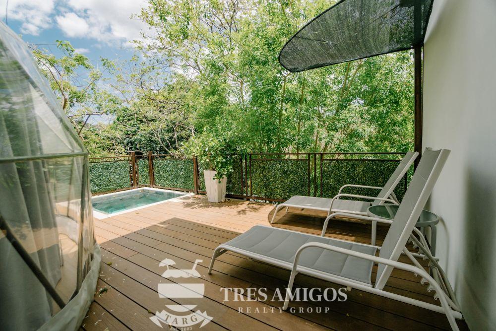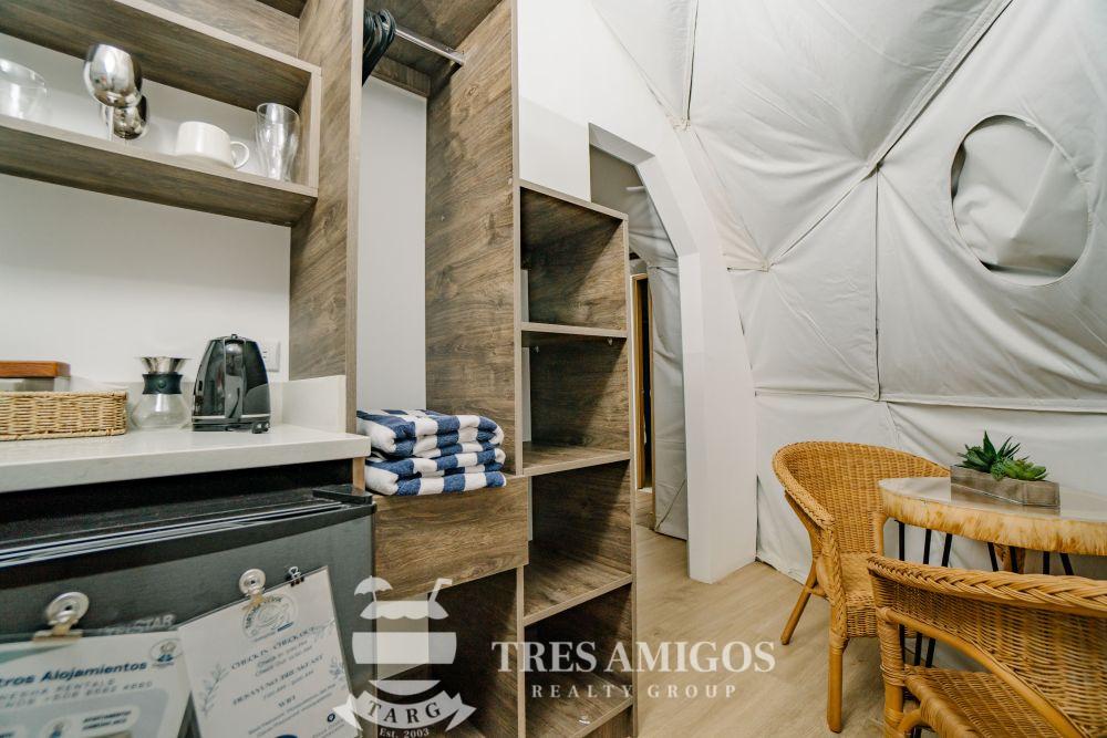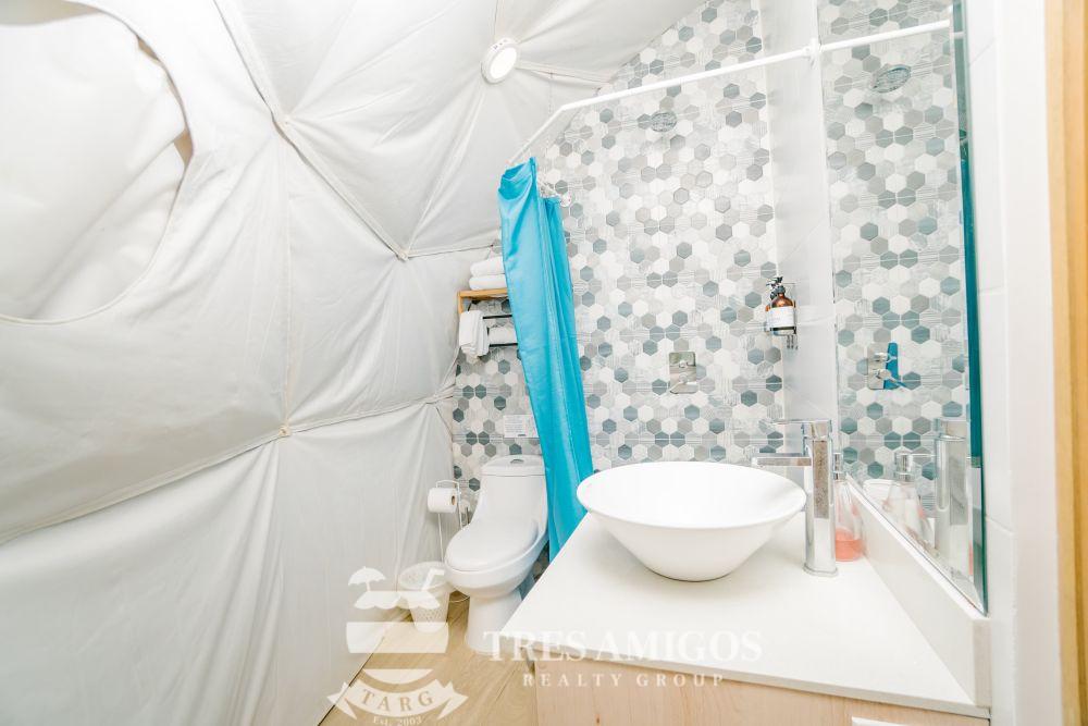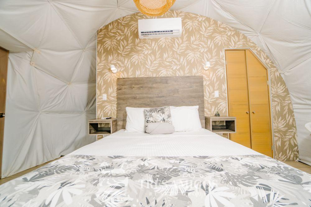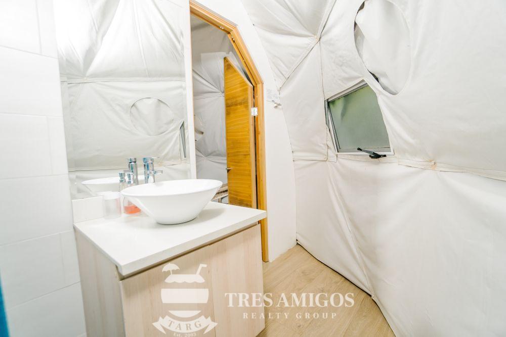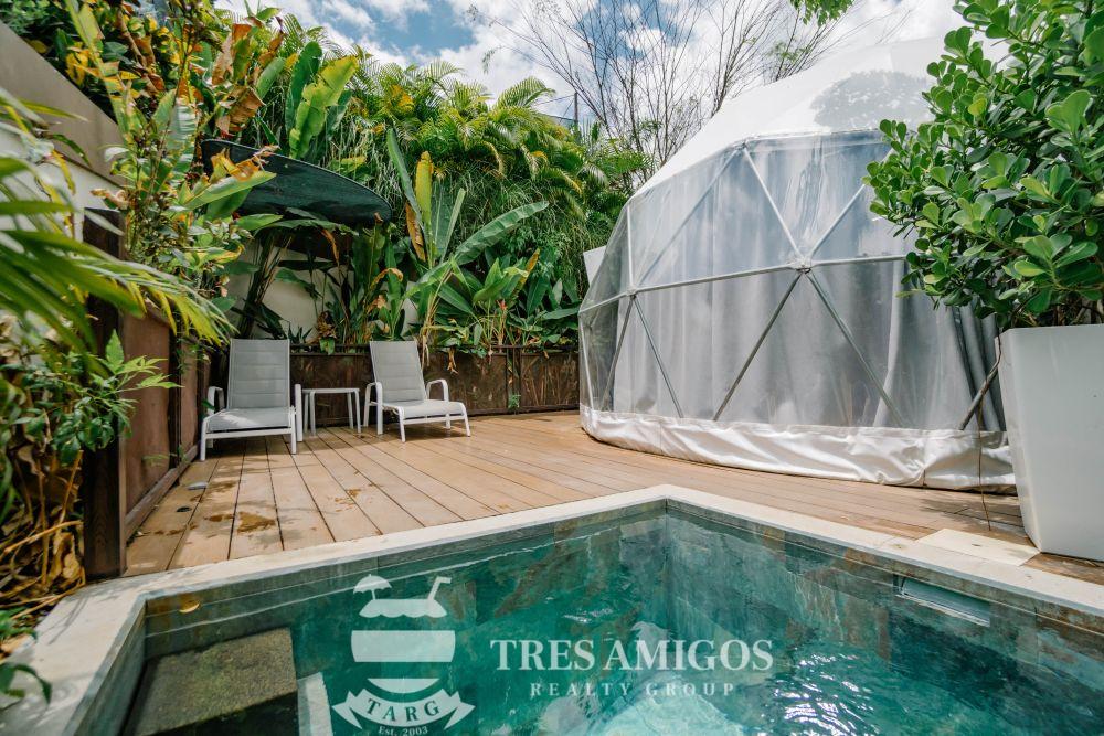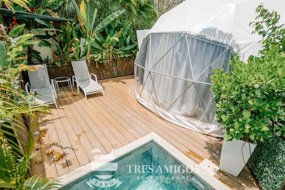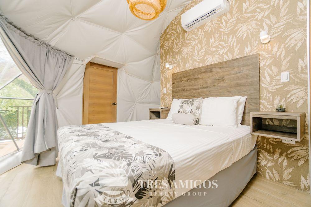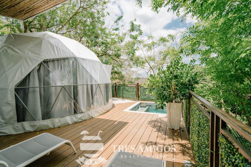 Tortuga Verde Glamping features seven premium 35 m² canvas domes, each equipped with a private ensuite bathroom, microwave, and comfortable sitting area. Every dome opens to its own outdoor terrace, where guests can enjoy a private plunge pool surrounded by lush tropical greenery for added privacy and relaxation. These domes offer elevated, nature-immersive lodging while still providing modern amenities. All accommodations—both at the hotel and in the glamping domes—include air conditioning, high-speed Wi-Fi, and flat-screen TVs. The property is fully gated and features a reception area at the entrance and a parking lot.