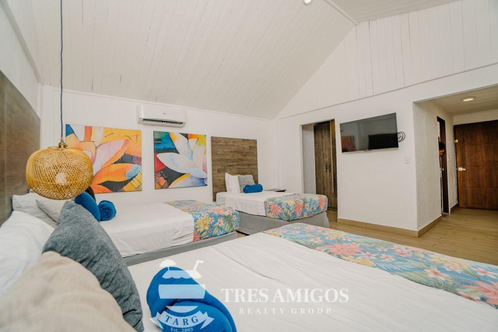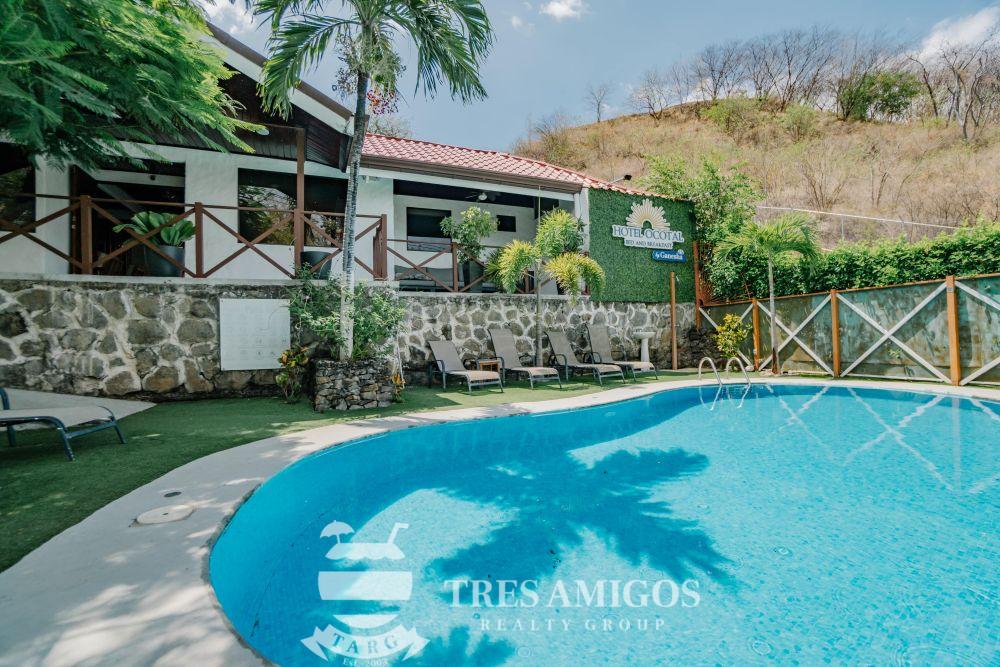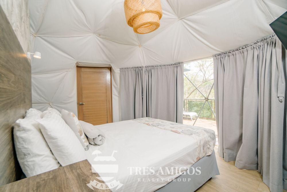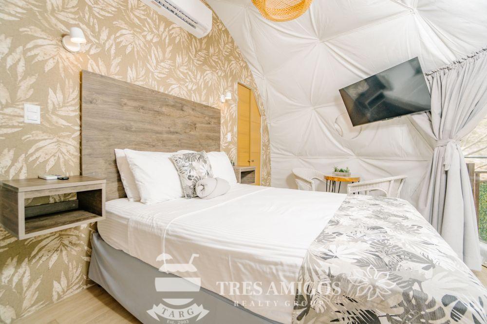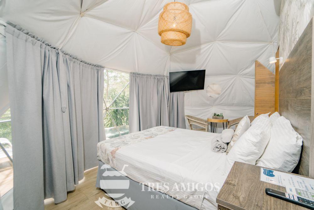 These adjacent boutique properties—Hotel Ocotal and Tortuga Verde Glamping Domes—are offered together as a fully turnkey hospitality investment. They are ideally located a short walk from Ocotal Beach and just 2 km from Playas del Coco. Hotel Ocotal features eight spacious guest rooms, 8.5 bathrooms, a staff room, a fully equipped kitchen, a comfortable sitting area, and a dedicated workstation suitable for remote workers. The hotel sits on a 1,150 m² lot, while the glamping domes occupy an additional 1,462 m². Fully renovated in 2023, the hotel now boasts modern finishes, updated bathrooms, flat-screen TVs, air conditioning, and strong rental demand. Guests enjoy a tropical swimming pool with loungers, an outdoor restaurant with a commercial kitchen and breakfast service, a co-working area, and several inviting social spaces. The room configuration includes one Standard Single room with a double bed; four Double Rooms with two double beds; two Queen Rooms with two queen-sized beds; and one Family Triple room with three beds—offering excellent flexibility and maximizing occupancy and revenue potential.