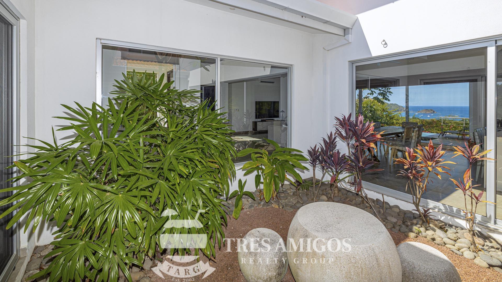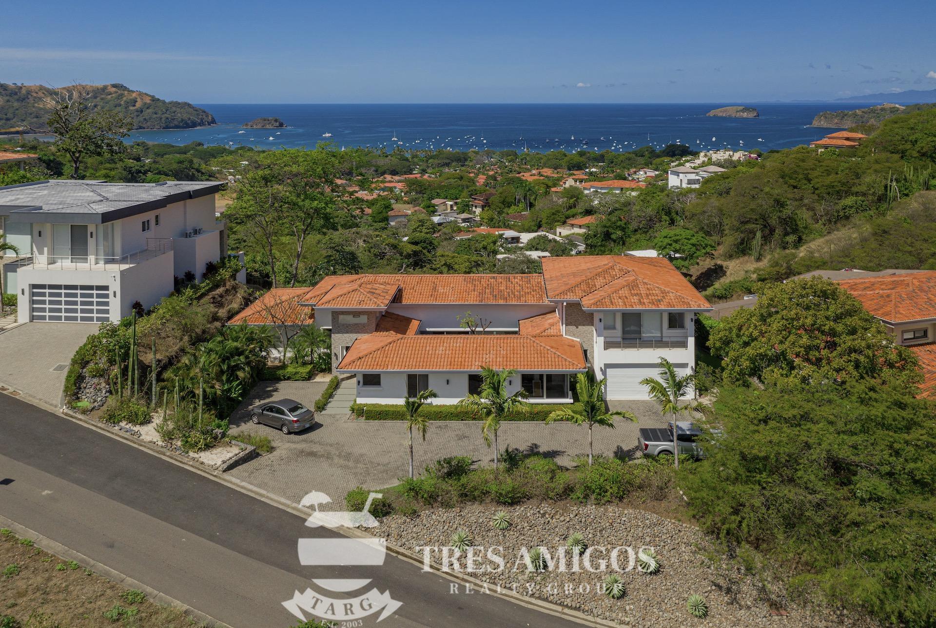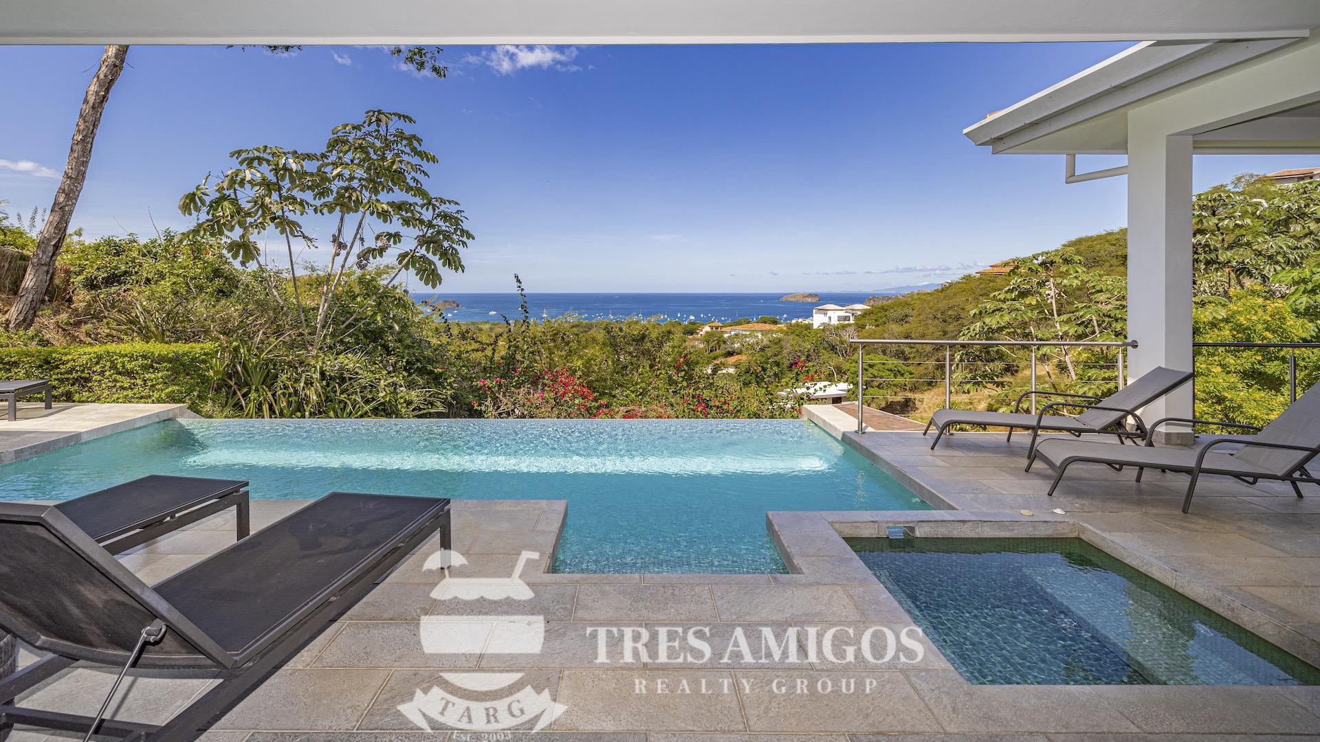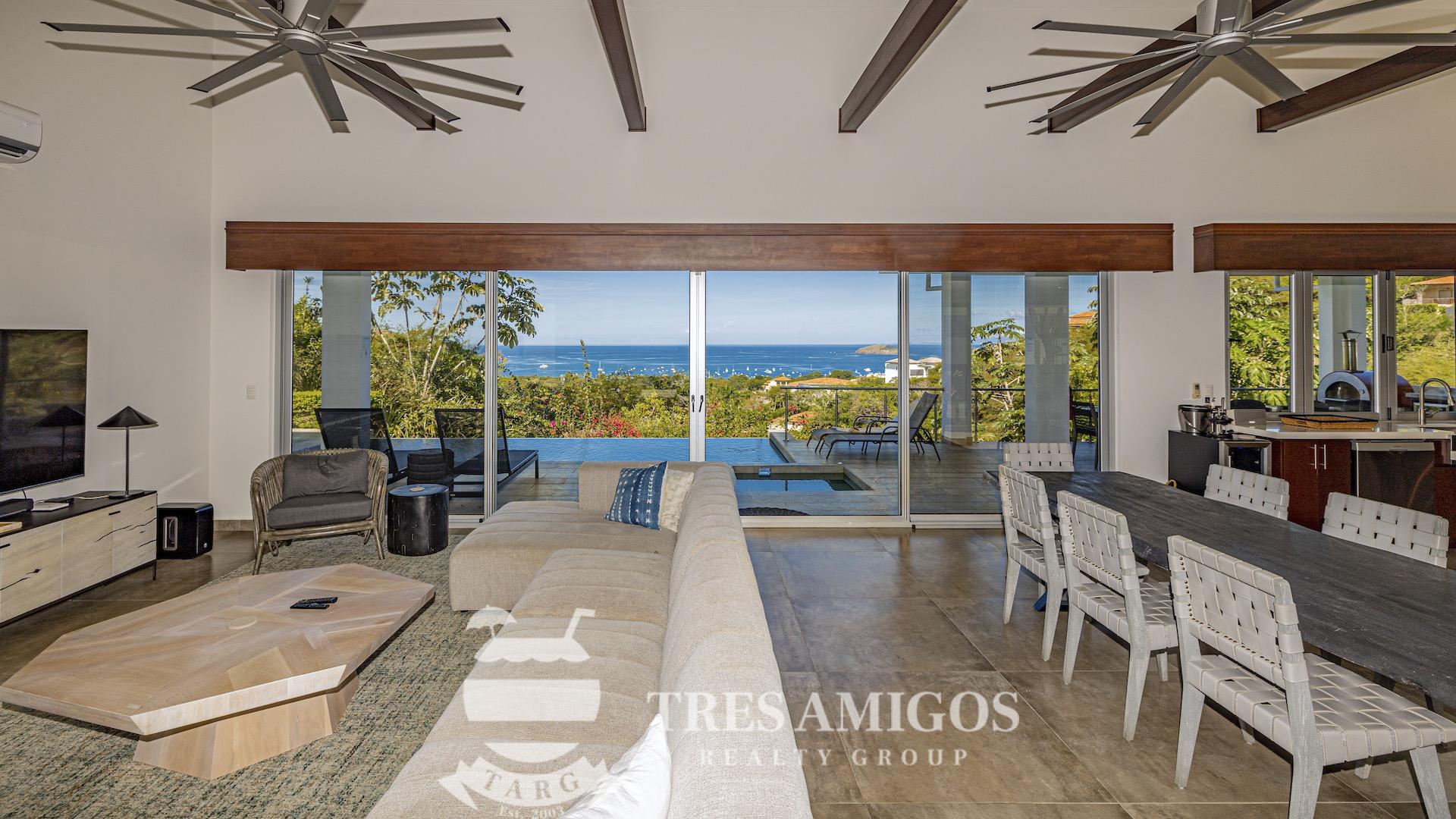 This impeccably built luxury residence offers 3,700 square feet of air-conditioned living space on a generous 1,834 square meter lot within the private, gated Pacifico community, boasting commanding ocean views over Playas del Coco and the Golfo Papagayo while remaining just minutes from the charm and conveniences of this vibrant beach town and nearby coastal destinations. Designed as an open-concept home for both refined living and effortless entertaining, the main living, dining, and kitchen areas flow seamlessly together and open directly onto the expansive pool terrace, creating a perfect indoor–outdoor lifestyle. The home features an infinity-edge pool, outdoor jacuzzi, sauna with full bath, and a lower ocean-view terrace, complemented by multiple shaded terraces with lounge areas, separate dining areas both indoors and outdoors on the shaded terrace, an outdoor grill, and a wood-fired pizza oven. A large internal Zen garden provides a tranquil architectural focal point, beautifully connecting the great room with the air-conditioned media and game room, which also offers the flexibility to be converted into an additional bedroom. The property includes a fully equipped main kitchen plus an additional full kitchen, an expansive second-floor primary suite with stunning views, and three additional en-suite bedrooms on the main level, all generously sized to accommodate king beds. Additional highlights include a Sonos sound system, attached two-car garage, high-quality construction and finishes throughout, full air conditioning, and a triple filtration and water softening system delivering bottled-water quality from every tap. Ideally located just minutes from multiple beach towns and a full array of services including shopping, dining, nightlife, watersports, medical and dental care, and only 25 minutes from Guanacaste International Airport (LIR), owners also enjoy access to Pacifico’s exceptional amenities and the exclusive Pacifico Beach Club with direct access to the sandy beaches of Playas del Coco, oceanfront dining, and resort-style pools and lounge areas, completing a truly elevated coastal lifestyle.