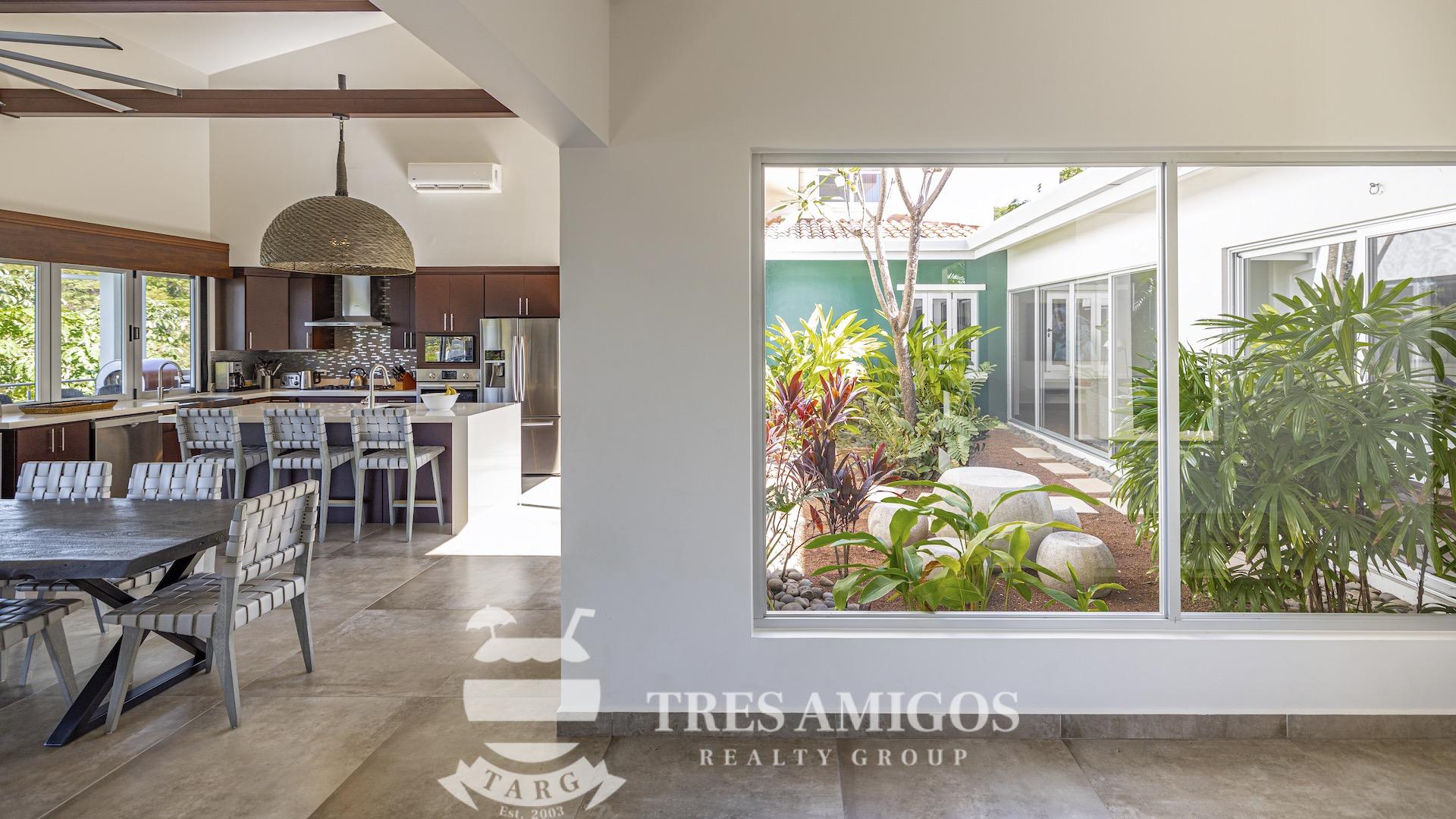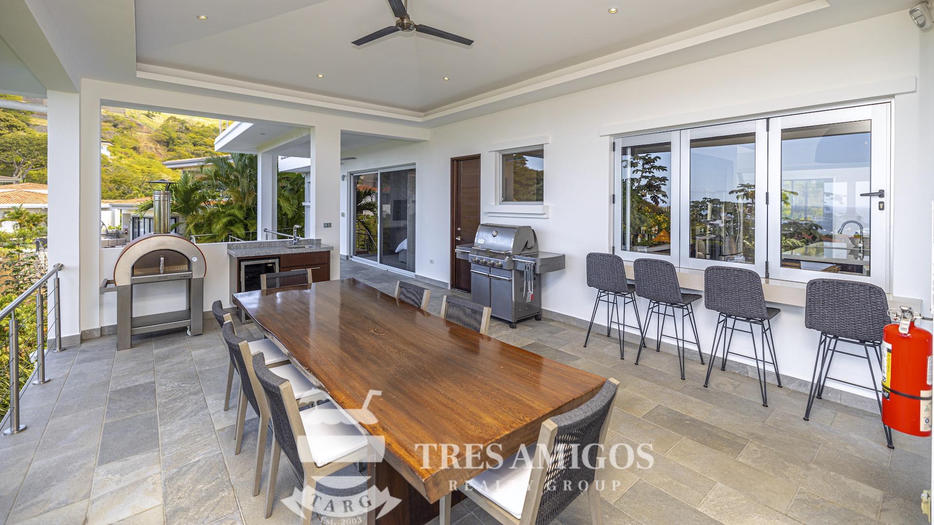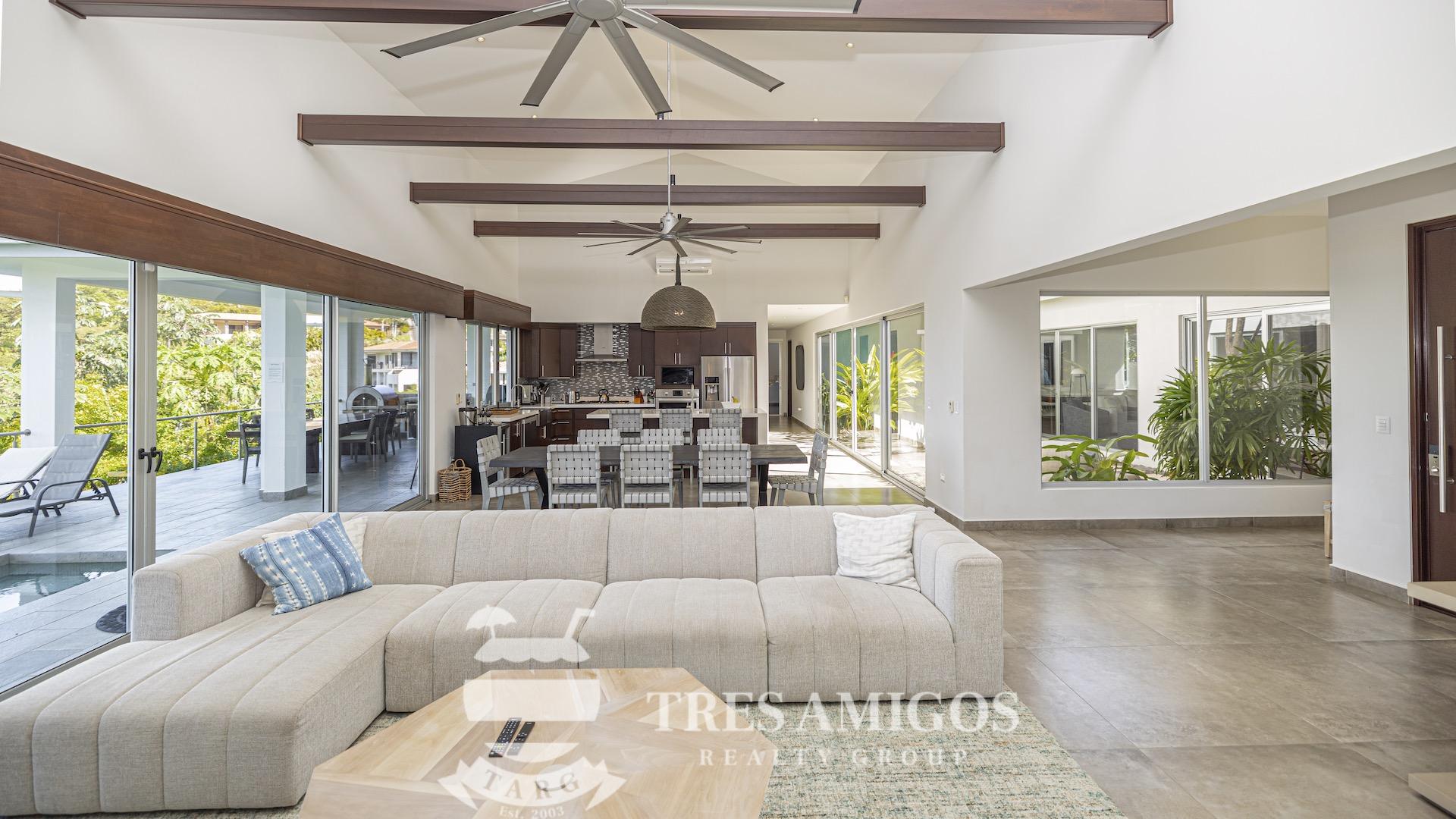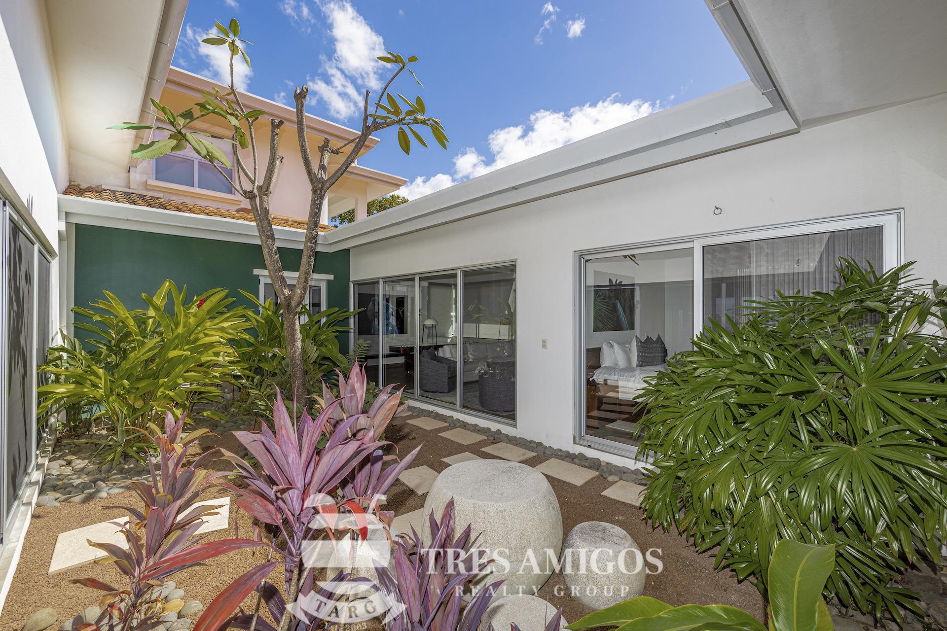 This impeccably built luxury residence offers 3,700 square feet of air-conditioned living space on a generous 1,834 square meter lot within the private, gated Pacifico community, boasting commanding ocean views over Playas del Coco and the Golfo Papagayo while remaining just minutes from the charm and conveniences of this vibrant beach town and nearby coastal destinations. Designed as an open-concept home for both refined living and effortless entertaining, the main living, dining, and kitchen areas flow seamlessly together and open directly onto the expansive pool terrace, creating a perfect indoor–outdoor lifestyle. The home features an infinity-edge pool, outdoor jacuzzi, sauna with full bath, and a lower ocean-view terrace, complemented by multiple shaded terraces with lounge areas, separate dining areas both indoors and outdoors on the shaded terrace, an outdoor grill, and a wood-fired pizza oven. A large internal Zen garden provides a tranquil architectural focal point, beautifully connecting the great room with the air-conditioned media and game room, which also offers the flexibility to be converted into an additional bedroom. The property includes a fully equipped main kitchen plus an additional full kitchen, an expansive second-floor primary suite with stunning views, and three additional en-suite bedrooms on the main level, all generously sized to accommodate king beds. Additional highlights include a Sonos sound system, attached two-car garage, high-quality construction and finishes throughout, full air conditioning, and a triple filtration and water softening system delivering bottled-water quality from every tap. Ideally located just minutes from multiple beach towns and a full array of services including shopping, dining, nightlife, watersports, medical and dental care, and only 25 minutes from Guanacaste International Airport (LIR), owners also enjoy access to Pacifico’s exceptional amenities and the exclusive Pacifico Beach Club with direct access to the sandy beaches of Playas del Coco, oceanfront dining, and resort-style pools and lounge areas, completing a truly elevated coastal lifestyle.