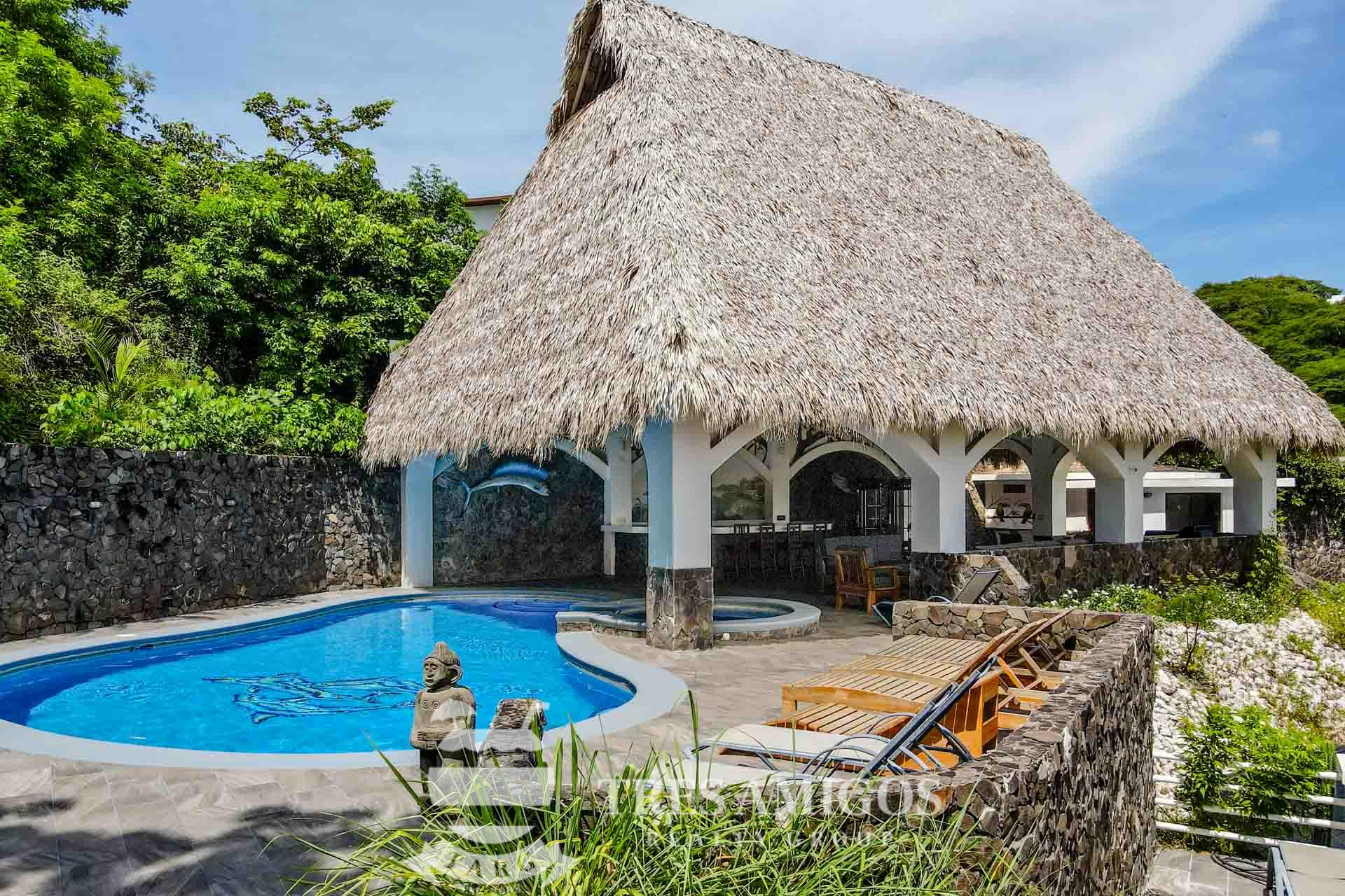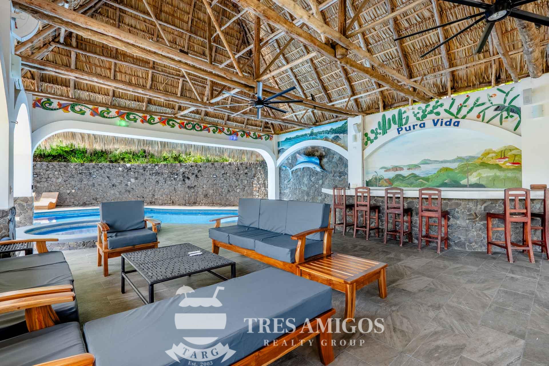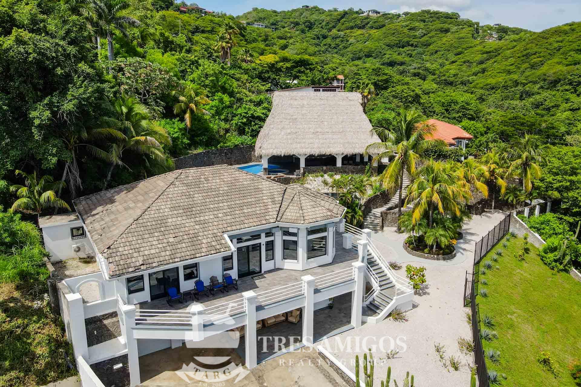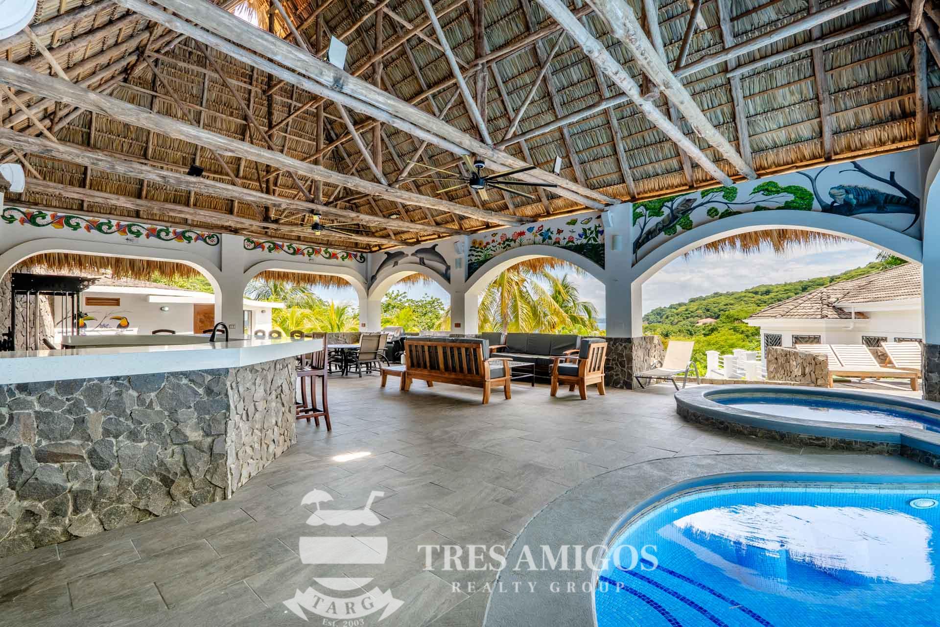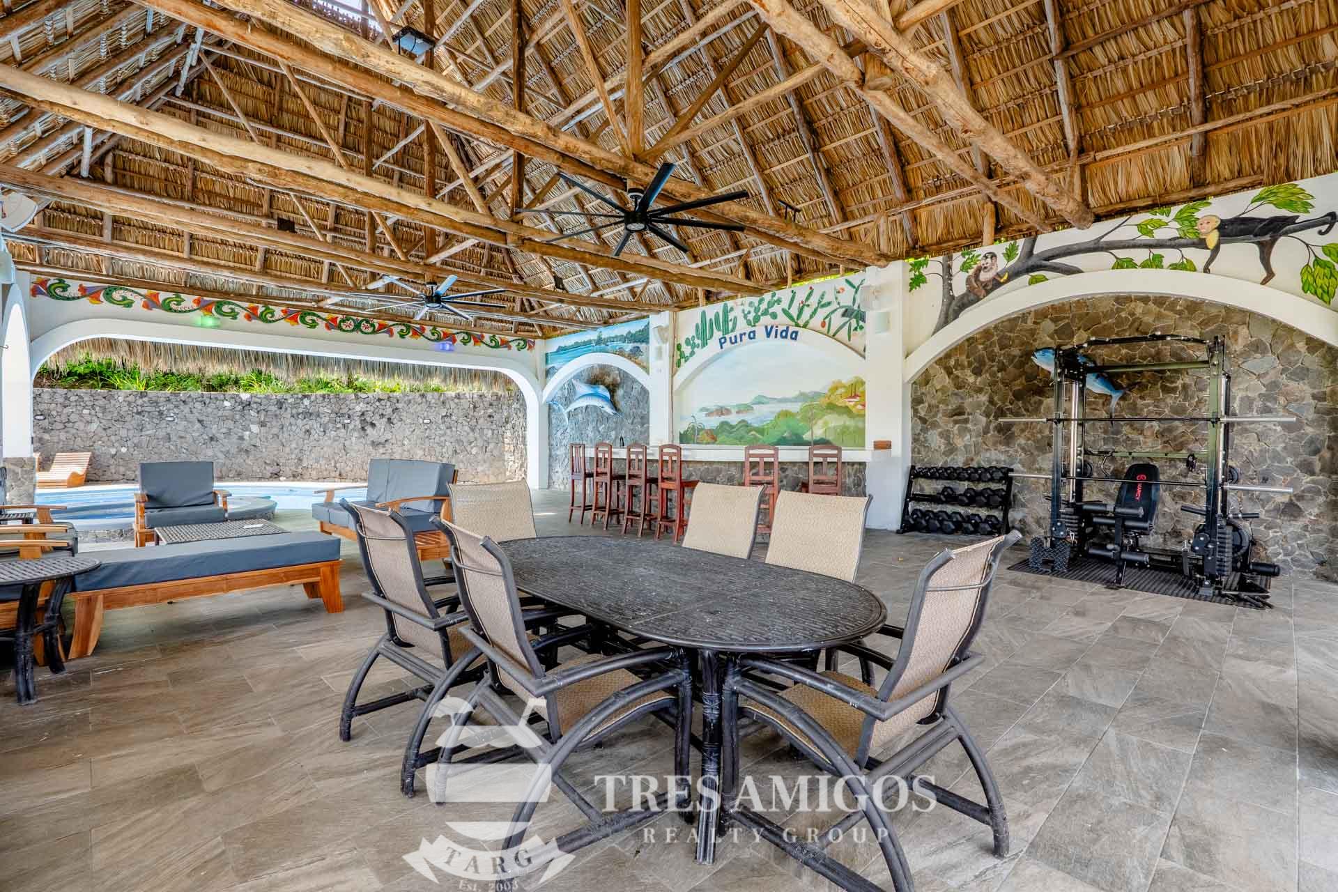The property’s best feature is the impressive, open-air pavilion. Situated on the highest tier of the estate, this grand structure features a beautiful thatched roof and is a complete entertainment hub. It includes a full-service bar, a kitchen, a bathroom, and multiple zones for lounging, recreation, and fitness. The pavilion overlooks a large swimming pool, a heated jacuzzi, and a sun-drenched deck—all offering ocean views. The lower level of the villa provides a two-car garage with a large, secure storage room. It also houses a fully independent guest suite with its own kitchen, dining area, bedroom, and bathroom. Adjacent to this apartment is an additional bedroom with a private ensuite. Crafted for large gatherings, Villa Perfecta Vida is perfectly suited for family and friends seeking to enjoy Costa Rica’s idyllic climate. The professionally landscaped, terraced gardens provide a tranquil and secluded atmosphere. With over 8,700 square feet of total living space, including the 3,490-square-foot outdoor terraces and pavilion, this home provides immense scale. The property also features a diesel generator, reserve water system and a pool heater for ultimate comfort.